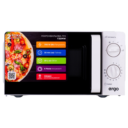 Мікрохвильовка ERGO Y30MW потужністю 700 Вт швидко розморозить продукти та рівномірно розігріє їжу. Крім цього, модель має 6 режимів, які дозволяють готувати прості страви легко та без зайвих зусиль.