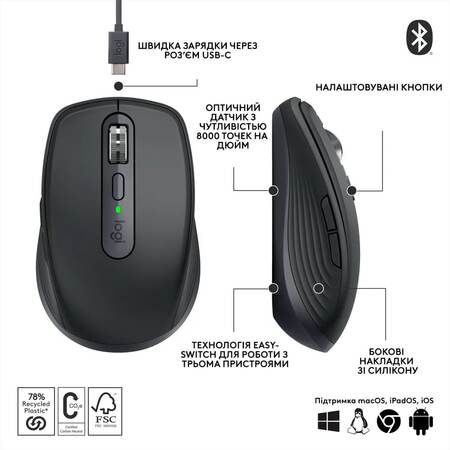 Миша MX Anywhere 3S тепер також оснащена оптичним датчиком чутливістю 8000 точок на дюйм, що забезпечує найвищу швидкодію на будь-якій поверхні, навіть на склі.
