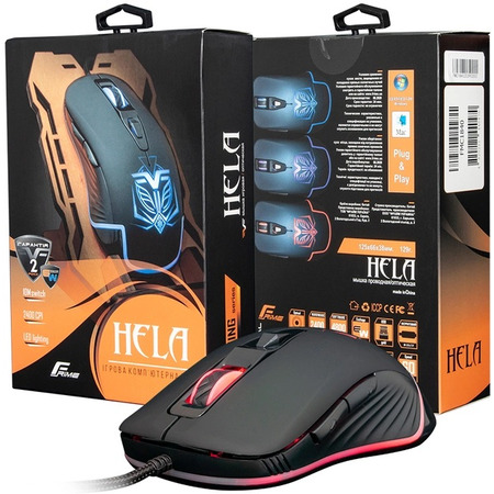 Миша Frime HELA Black - це універсальна дротова миша, з ергономічним корпусом, софттач покриттям і довгим проводом 180 см. Світчі з 10-мільйонною кількістю натискань і оптичним сенсором, здатним працювати з 2400 dpi. Кабель захищений від перегину біля основи миші, а також має позолочений USB коннектор. Верхня панель маніпулятора виконана з приємного на дотик софттач пластика матового кольору з ілюмінуючим малюнком.