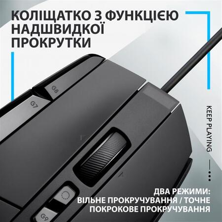 Новий погляд на легендарний пристрій. G502 X — нова миша з легендарної лінійки G502. Її дизайн було оновлено та модернізовано з використанням інноваційних ігрових технологій, включаючи перші в історії гібридні оптико-механічні перемикачі LIGHTFORCE. Тепер в одному пристрої поєднуються неймовірна швидкість, надійність і точність керування. А механічні технології дозволять гравцям насолодитися чітким спрацьовуванням з тактильним відгуком. Датчик HERO 25K Наш передовий ігровий датчик досягає субмікронної точності й відрізняється такими характеристиками, як нульове згладжування, фільтрація та прискорення. Завдяки винятковій чутливості та ефективному споживанню енергії HERO 25K забезпечує високу продуктивність, неймовірну енергоефективність і точність. Кнопка, що регулює зміни чутливості Ми оновили дизайн кнопки змінили чутливість, щоб ви могли самостійно вибрати конфігурацію, що відповідає розміру вашої долоні та власним уподобанням. Витягніть і переверніть кнопку, щоб вона була ближче до великого пальця, або замініть її кришкою з комплекту поставки. Зменшена вага Дизайн легендарної миші G502 зазнав деяких змін: полегшене коліщатко прокручування та жорстка тонкостінна конструкція, що не потребує великих витрат матеріалів, дозволило знизити вагу пристрою до 89 грамів. Колесо прокручування, що працює в двох режимах Полегшене коліщатко вільно обертається в надшвидкому режимі. Одним натисканням кнопки ви зможете перейти в режим покрокового точного прокручування. А нахиляючи коліщатко ліворуч і праворуч, ви отримаєте доступ до двох додаткових повністю програмованих елементів управління.
