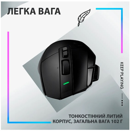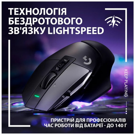 Новий погляд на легендарний пристрій G502 X Lightspeed - новий пристрій з легендарної лінійки G502. Її дизайн було оновлено та модернізовано з використанням інноваційних ігрових технологій. Наша миша оснащена першими в історії гібридними перемикачами Lightforce, бездротовим зв'язком Lightspeed професійного рівня та оптичним датчиком HERO 25K. Крім того, G502 X Lightspeed сумісна з технологією Powerplay – завдяки цьому вона ніколи не буде розряджатися. Перемикачі Lightforce Інноваційні оптико-механічні перемикачі гібридного типу відрізняються надійністю та швидкістю спрацьовування завдяки використанню оптичних елементів. А механічні технології дозволять гравцям насолодитися чітким спрацюванням із тактильним відгуком. Технологія бездротового зв'язку Lightspeed Можливості підключення за оновленим протоколом професійного рівня забезпечують вражаючу швидкість відгуку, яка на 68% вища порівняно з попереднім поколінням. Завдяки використанню енергоефективної технології Lightspeed час роботи G502 X Lightspeed від батареї складає цілих 140 годин. Датчик HERO 25K Наш передовий ігровий датчик досягає субмікронної точності та відрізняється такими характеристиками, як нульове згладжування, фільтрація та прискорення. Завдяки винятковій чутливості та ефективному споживанню енергії HERO 25K забезпечує високу продуктивність, неймовірну енергоефективність та точність. Регульована кнопка зміни чутливості Ми оновили дизайн кнопки зміни чутливості, щоб ви могли самостійно вибрати конфігурацію, що відповідає розміру вашої долоні та власним смаковим уподобанням. Витягніть і переверніть кнопку, щоб вона була ближчою до великого пальця, або замініть її кришкою з комплекту поставки. Коліщатко прокручування, що працює в двох режимах Полегшене коліщатко вільно обертається в надшвидкому режимі. Одним натисканням кнопки ви зможете перейти в режим покрокової точної прокручування. А нахиляючи коліщатко ліворуч і праворуч, ви отримаєте доступ до двох додаткових повністю програмованих елементів управління. Підтримка технології Powerplay Ми оновили дизайн кнопки зміни чутливості, щоб ви могли самостійно вибрати конфігурацію, що відповідає розміру вашої долоні та власним смаковим уподобанням. Витягніть і переверніть кнопку, щоб вона була ближчою до великого пальця. Її також можна замінити кришкою.