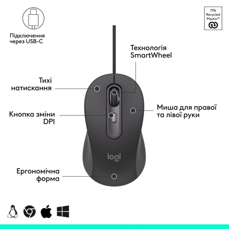 Logitech Signature M520 – дротова офісна миша, розроблена для щоденного комфорту та ефективності. Має розширену сумісність, зручну форму та перевірену якість Logitech. Технологія SmartWheel дозволяє автоматично перемикатися між режимами точного та швидкого прокручування залежно від вашого завдання. А завдяки технології SilentTouch мишка створює менше звуку під час кліку. Кнопка DPI дозволяє змінювати швидкість курсора або налаштувати її для швидкого доступу до дій. За допомогою платформи Logi Options+ ви можете налаштувати клавіші дій відповідно до ваших унікальних робочих потреб, покращивши робочий процес та заощаджуючи цінний час. Миша Signature M520 сумісна з кількома платформами, такими як Windows, macOS, Linux, iPadOS та ChromeOS. Особливості: - ергономічна форма з симетричним дизайном для правої та лівої руки; - надійне дротове підключення через USB-C; - тихі натискання для зосередженої роботи; - прокрутка рядків для зручної навігації; - легка інтеграція з основними ОС без встановлення ПЗ; - виготовлена з використанням переробленого пластику.