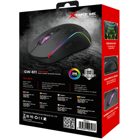 Ігрова мишка XTRIKE ME GW-611 розроблена для людей, які цінують комфорт та швидкість. Ергономічний корпус сприяє зручному розміщенню руки під час гри, а якісний оптичний сенсор забезпечує високу точність відстеження рухів та миттєву реакцію. Мишка XTRIKE ME GW-611 оснащена 7 кнопками, які розташовані в інтуїтивно зрозумілих для користувача місцях. Вона чудово підходить для різних типів ігор. Широкий діапазон регулювання роздільної здатності мишки - від 800 до 8000 DPI, дозволяє налаштувати мишку під необхідний ігровий стиль. Перфорована верхня панель мишки полегшує її конструкцію, що особливо важливо при швидкісних іграх. Поєднання оригінального дизайну корпусу з RGB підсвічуванням підкреслює ігровий характер мишки. Підключення мишки XTRIKE ME GW-611 здійснюється за допомогою технології бездротового радіозв’язку 2,4 ГГц або USB-кабелю довжиною 150 см. Ви зможете змінити спосіб підключення мишки навіть під час гри – перемикання відбувається миттєво.