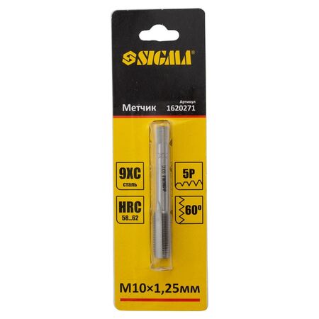 Мітчик М10×1.25мм SIGMA (1620271) призначений для нарізування внутрішніх різьблень. Являє собою гвинт з прорізаними стружковими канавками, що утворюють ріжучі кромки. Хвостовою частиною кріпиться в тримач для мітчиків (комірець), робочою частиною вводиться в отвір, в якому при провертанні тримача зворотно-поступальними рухами нарізається різьба. При нарізанні, різьблення, попередньо, змащують консистентним мастилом.