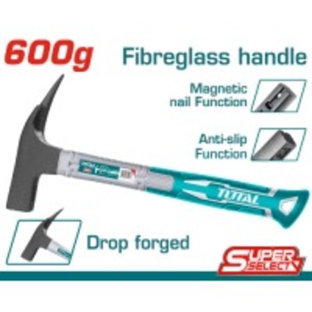 Покрівельний молоток TOTAL THTRH6006 виготовлений з вуглецевої сталі С45. Гартування головки надає високу міцність і зносостійкість. Обладнаний спеціальним магнітним пазом для фіксації цвяха. Ручка виготовлена зі скловолокна з вставками з термопластичної гуми. Одна зі сторін у вигляді ударного бойка, інша являє собою загострений клин для пробивання отворів і відгинання крайок.