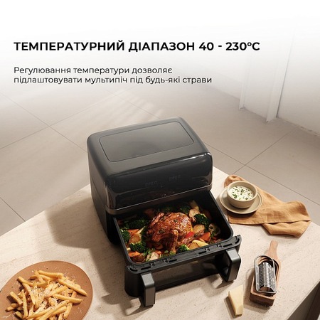 Готуйте інгредієнти в повному обсязі так само, як у традиційній духовці завдяки цільній ємності для приготування об’ємом 9л, ідеально підходить для сімейних обідів, оскільки місткість дозволяє легко розмістити 6 і більше порцій.