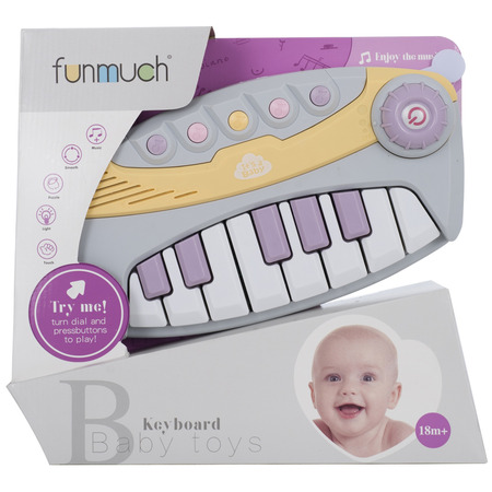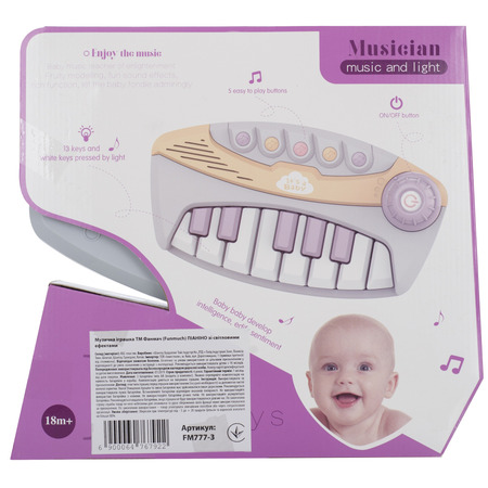 Музична іграшка зі світловими ефектами ПІАНІНО ТМ Funmuch. Має 13 клавіш піаніно та 5 кнопок додаткових звукових ефектів, а також супровід світловими ефектами. Малюк легко зможе створити свою власну мелодію, натискаючи на кнопки або відтворить 5 стандартних композицій. Живлення: 3 батарейки типу AA (входять у комплект). Матеріал: АБС-пластик. Підходить для дітей від 18 місяців. Розмір іграшки: 26х6.5х13.5 см. Упаковка: відкрита коробка 27.5х25.5х7.5 см.