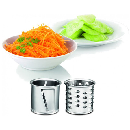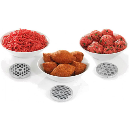 М'ясорубка з високою потужністю 1600 Вт та продуктивністю до 1,9 кг в хвилину швидко подрібнить навіть тверде м'ясо. Насолоджуйтеся різноманітністю різних рецептів, які ви можете легко приготувати завдяки універсальності пристрою: 3 різні решітки для м'яса (для дрібного, середнього, грубого подрібнення), насадка для томатів і ягід, 2 барабана для терки/шинкування, насадка для ковбас.