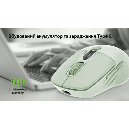Вбудована літієво-іонна акумуляторна батарея ємністю 400 мАч забезпечує тривалу автономну роботу. Заряджання здійснюється через USB Type-C, що дозволяє одночасно користуватися мишкою та заряджати її, забезпечуючи безперервний робочий процес.