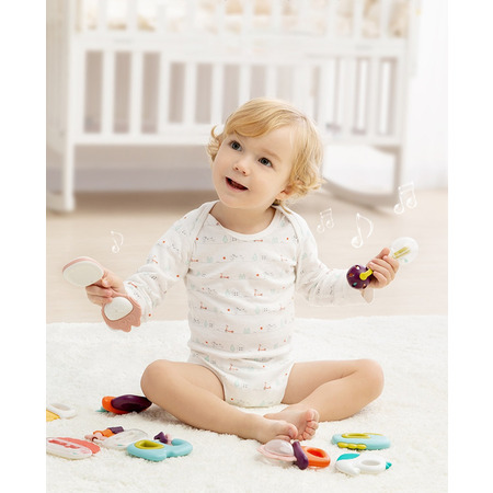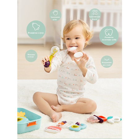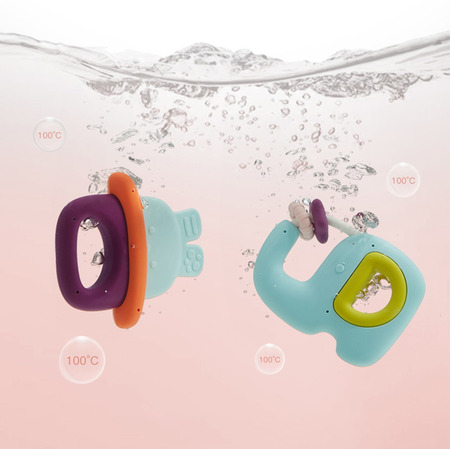 При встряхивании, издает звук для привлечения внимания ребенка. Силиконовые элементы предназначены для прорезывания зубов. Можно использовать как игрушки для купания. Стерилизация при 100°С в течение 10-30 секунд, не касаясь дна кастрюли.