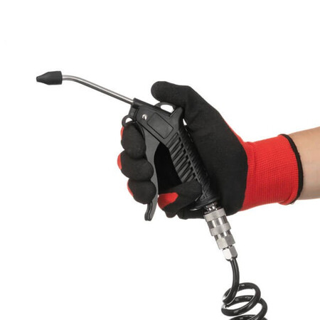 Головна особливість цього інструмента - це наявність вигнутої подовженої сталевої насадки 100 мм з пластиковим наконечником, яка дозволяє продувати навіть важкодоступні місця завдяки великій швидкості повітря та робочого тиску до 8 атм.