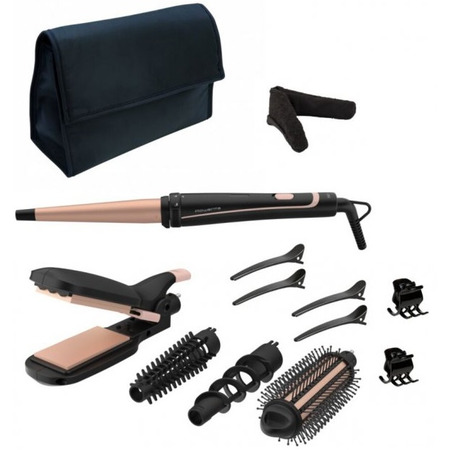 Мультистайлер працює як випрямляч 2 в 1 із системою Smart Switch і щипцями гофре, круглою щіткою з нагріванням (діаметром 32 мм) і конічними щипцями для завивки, а також оснащений комплектом додаткових аксесуарів - насадкою для створення спіральних локонів, щіткою для додання об’єму, сумкою для зберігання та іншими.