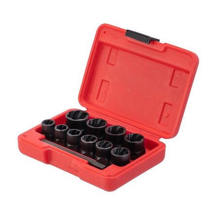 Набір подовжених екстракторів для пошкоджених болтів і гайок SD-8008 необхідний для демонтажу болтів і гайок, що пошкоджені чи мають стерті грані. Набір містить 10 екстракторів, діаметром 9, 10, 11, 12, 13, 14, 15, 16, 17, 19 мм, і виколотку для витягування застряглих кріплень. Всі елементі набору виготовлені з хром молібденової сталі, яка гарантує високу міцність і тривалий строк служби. Подовжена форма екстракторів дозволяє діставати глибоко посаджені болті і гайки.
