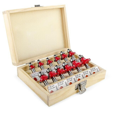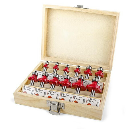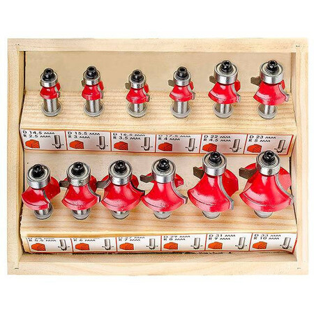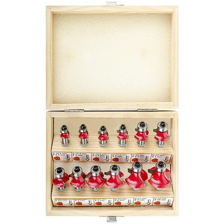 У наборі 12 фрез різного діаметра: 15,5, 16,5, 17,5, 22, 23, 26, 27, 29, 31, 33 мм. Наявність підшипника на кожній фрезі дозволяє обробляти профіль заготовки без застосування додаткового обладнання та упору фрезерного верстата на опорну напрямну. Завдяки таким калювальним фрезам, надається багата та складна форма краю заготовки, завдяки цьому виготовляють фігурні ніжки столів, стільців, шаф, інших меблів та декоративних виробів.