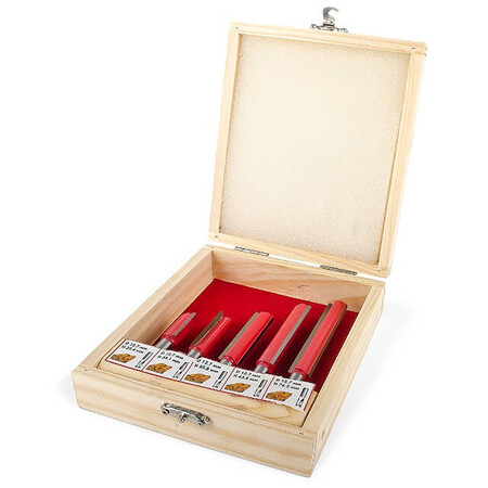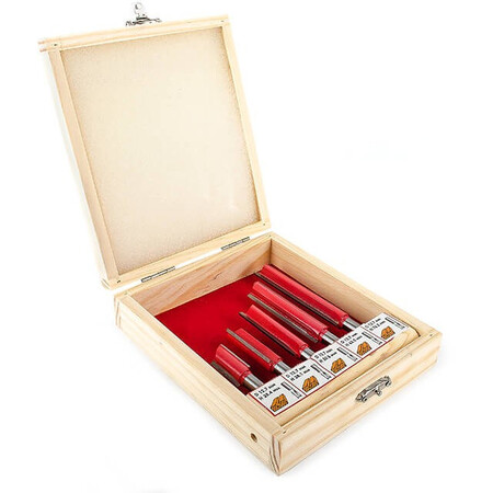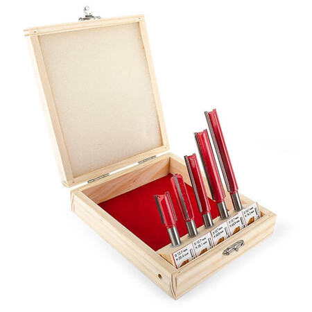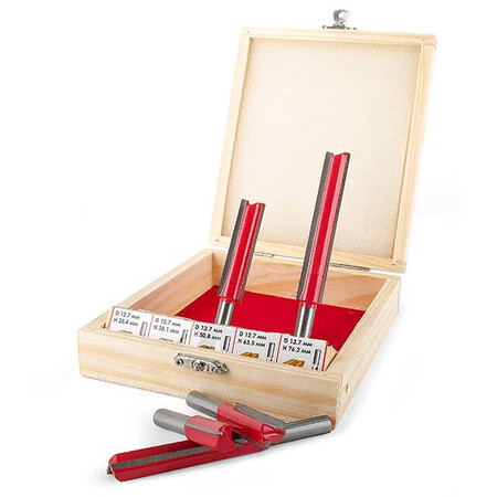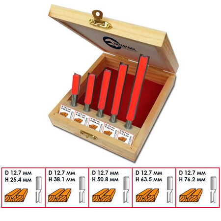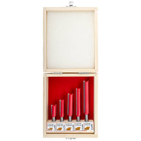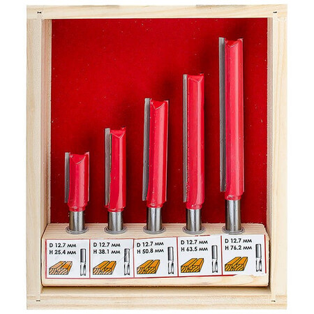 Даний набір містить 5 фрез, діаметром 12,7 мм, різної довжини: 25.4; 38.1; 50.8; 63.5; 76 мм. Фрези працюють з дерев'яним брусом, товстою фанерою або листами МДФ, робить зріз потрібного діаметра гладким і без сколів. Бічні різці підрізають волокна по краю, після чого ріжуча крайка рівно зрізує сам матеріал без деформації. Це робить отвір гладким без додаткових зусиль та витрат. Різак плавно входить у заготовку, забезпечуючи чистоту та відсутність скалок.