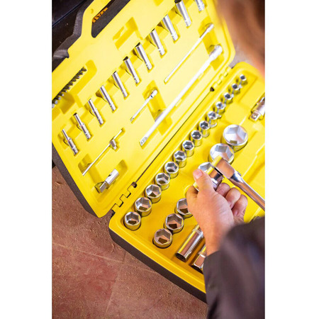 Пластиковий кейс. Тріскання 1/4″, 120 зубів, L=130 мм. Головки стандартні 1/4″ (шестигранні): 4 - 4,5 - 5 - 5,5 - 6 - 7 - 8 - 9 - 10 - 11 - 12 - 13 - 14мм. Головки високі 1/4″ (шестигранні): 4-5-6-7-8-9-10-11-12-13-14 мм. Подовжувачі 1/4″: 75 мм, 150 мм.
