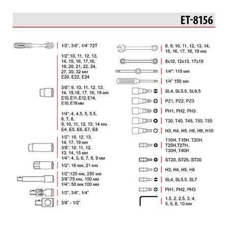 Набір зі 156 одиниць інструменту стане надійним помічником у вашій майстерні або гаражі. Основою набору є три тріскачки з посадковими квадратами 1/2", 3/8", 1/4", а також шестигранні головки розміром від 4 до 32 мм.