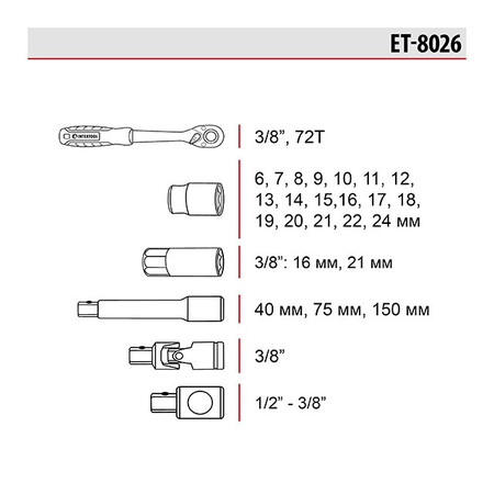 Основою набору є тріскачка з посадковим квадратом 3/8". Шестигранні головки дозволяють працювати з кріпленнями, розміром від 6 до 24 мм. Подовжувачі, довжиною 40, 75, 150 мм та кардан в комплекті знадобляться у важкодоступних місцях. Свічкові головки 16 та 21 мм з гумовими вставками знадобляться для монтажу свічок запалювання.