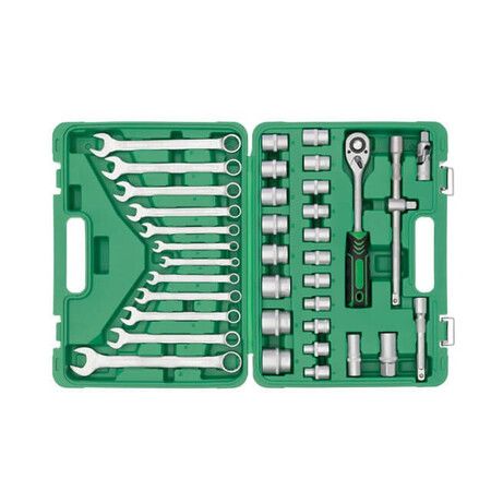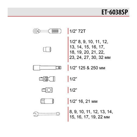 Набір з комплектацією на 38 одиниць включає тріскачку з посадковим квадратом 1/2", набір шестигранних головок від 8 до 32 мм, вони підходять для виконання різнопланових робіт на закручування та відкручування кріплень.