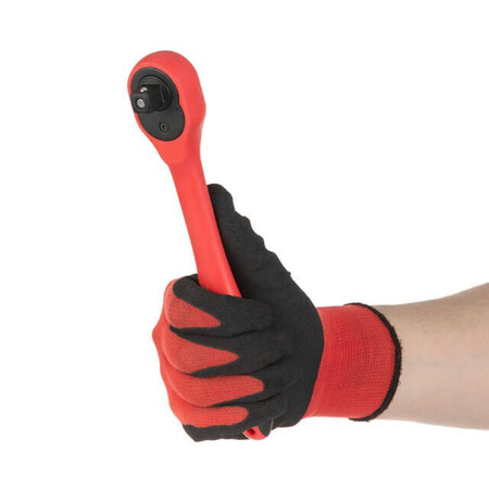 Невеликий вигин руків'я збільшує комфорт при роботі з незручно розташованими кріпленнями. Тріскачка повністю вкрита захисним шаром поліпропілену з гумовими вставками на ручці для міцної фіксації інструмента в руці.