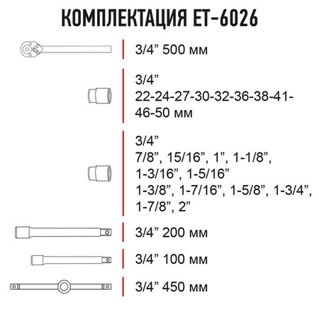 У професійний набір інструментів ET-6026 увійшли 12-гранні головки дюймових розмірів (7/8-2") та метричних розмірів (22-50 мм). Дванадцятигранні кріплення мають більшу кількість граней, у порівнянні зі звичайними шестигранними головками, завдяки цьому є більше можливостей для закріплення голови на гранях різного типу кріплень. Працювати у важкодоступних місцях, обмеженому просторі стає значно простіше та зручніше, завдяки таким головкам забезпечується швидкий та ефективний монтаж/демонтаж різьбових з'єднань.