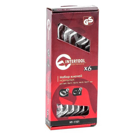 До набору INTERTOOL HT-1101 увійшли накидні ключі, розмірами: 6х7; 8х9; 10х11; 12х13; 14х15; 16х17 мм. Це дозволяє обрати необхідний розмір під будь-які завдання для монтажу та демонтажу різьбових з'єднань гайок та болтів.
