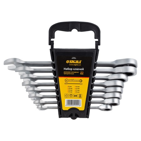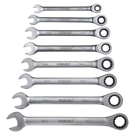 Набір ключів ріжково-накидних з тріскачкою 8шт (8, 10, 12, 13, 14, 15, 17, 19мм) CrV satine SIGMA (6010521) - використовується для роботи з болтовими з'єднаннями (для відкручування або закручування гайок і болтів).