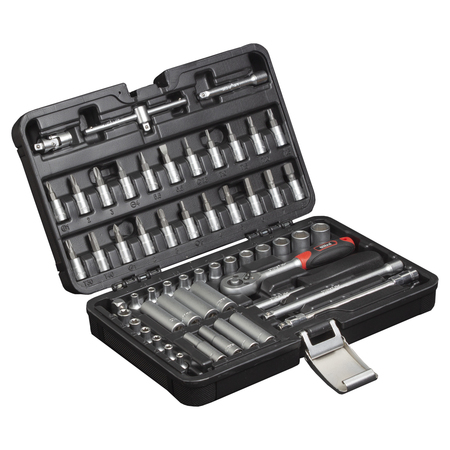 Надійний кейс з удароміцного пластику дозволяє систематизувати зберігання інструменту та забезпечує легкість у пошуку потрібного предмета. Кейс має посилені петлі, захисні накладки на кутах та металеві замки, які добре фіксуються та запобігають мимовільне відкриття кейса. Весь інструмент міцно фіксується в посадкових місцях, не висипаючись при транспортуванні.