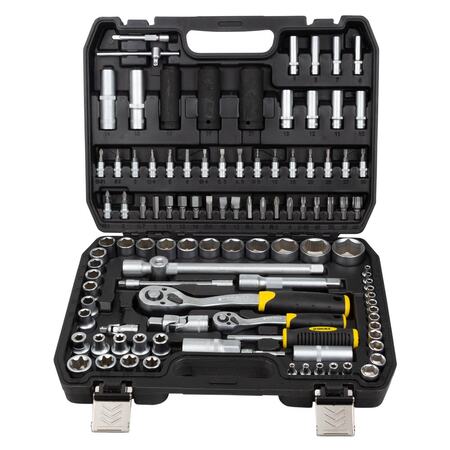 Для зручного зберігання та транспортування, набір поставляється в кейсі виконаного з міцного ABC-пластика. Кейс має посилені петлі та металеві замками, які добре фіксуються та запобігають мимовільне відкриття кейса. Весь інструмент міцно фіксується в посадкових місцях, не висипаючись при транспортуванні. Невеликі габаритні розміри набору дозволяють компактно розмістити його в багажному відділенні вашого автомобіля або в гаражі.