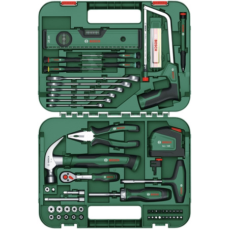 Короткий вступ: Універсальний набір інструментів Bosch, який містить все необхідне для різних видів робіт вдома, на гаражі або на будівництві.