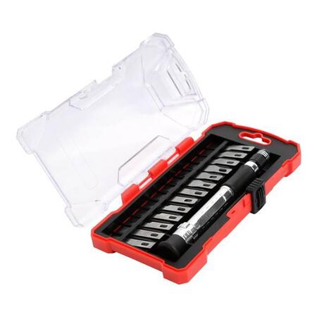 Завдяки наявності 13 різних форм лез можна виконувати різноманітні завдання без відриву від робочого процесу: все зручно розміщено в одному кейсі. Ручка-тримач має гумову накладку в місці хвату, що забезпечує кращу фіксацію в руці. Наявність поворотного ковпачка з поглибленням під палець для більшого комфорту та ефективної роботи.