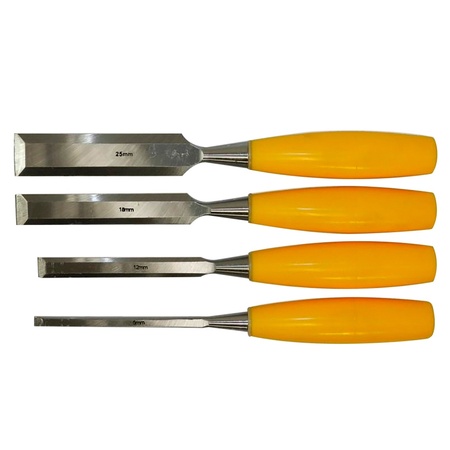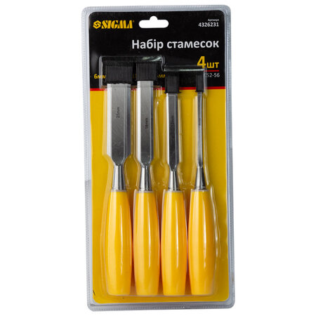 Набір стамесок 4 шт (6, 12, 18, 25мм) пластикова рукоятка SIGMA (4326231) складається з стамесок різного діаметру 6, 12, 18, 25мм. Використовуються для вибірки гнізд і пазів невеликої величини, для робіт з м'якими і твердими породами дерева, для стругання, а також прорізання різних отворів.