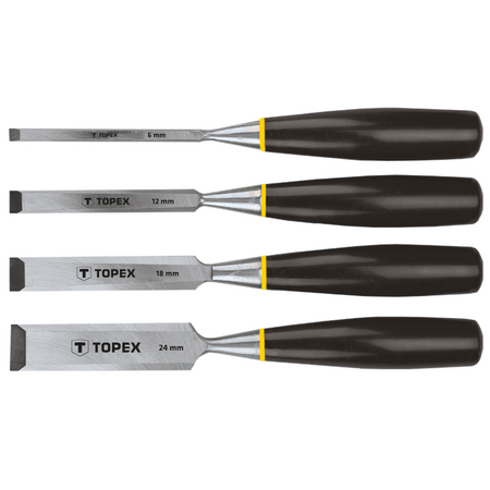 Набір стамесок TOPEX 09A310 - це інструмент, який складається з набору різних стамесок різних розмірів, від 6 мм до 24 мм. Стамески в цьому наборі призначені для деревообробки, столярних робіт, різання жолобів, вирізання вирізів та інших операцій, які потребують точності та дотримання геометричних розмірів. Кожна стамеска має свій власний розмір і форму, що дозволяє виконувати різноманітні види робіт з деревом.