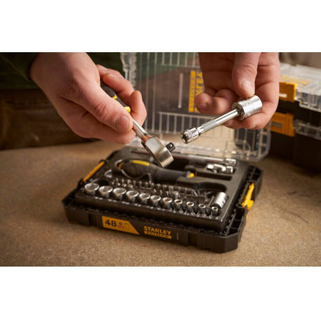 48 предметів у пластиковому кейсі ″MIDDLE PRO-STAK″: Рукоятка 1/4″ з храповим механізмом на 120 зубів із біматеріалу. Головки стандартні 1/4″ (шестигранні): 4 - 5 - 5,5 - 6 - 7 - 8 - 9 - 10 - 11 - 12 - 13 - 14 мм. Універсальний шарнір типу ″Карадан″ 1/4″.
