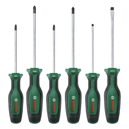 - Набір Bosch складається з 6 викруток PH/PZ/SL, що гарантує широку сферу застосування.