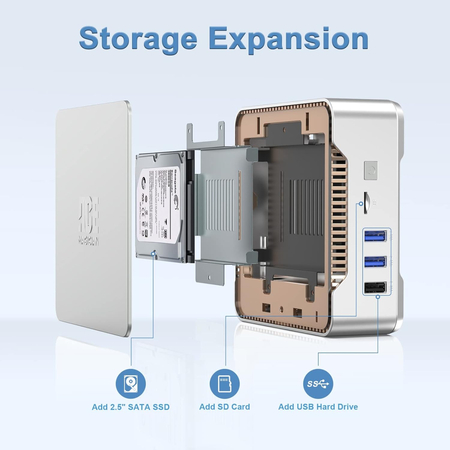 Міні-комп’ютер оснащений великим об’ємом пам’яті 12GB LPDDR4 і 256GB M.2 2280 SATA SSD, що дозволяє маленькому ПК виконувати кілька високопродуктивних операцій одночасно. Підвищіть швидкість роботи та уникайте затримок. Твердотільний накопичувач мінікомп’ютера є змінним і постачається з SSD-накопичувачем ємністю 256 ГБ, який можна оновити до 2 ТБ. Додавши 2,5-дюймовий SSD/HDD (не входить до комплекту).