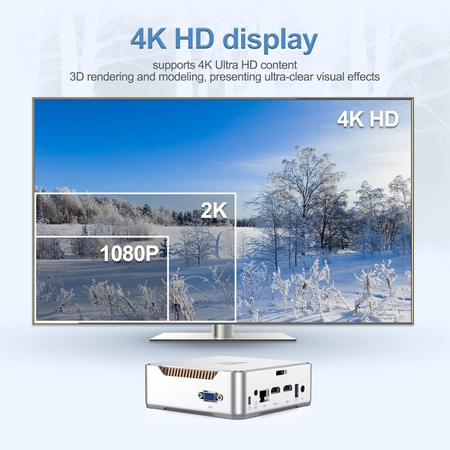 У міні-ПК Acemagician вбудований графічний процесор Intel UHD Graphics, який забезпечує більш швидку обробку зображень і відтворення відео 4K UHD (4096x2160@60Hz). Ви можете насолоджуватися 4K відео домашнього кінотеатру, онлайн-навчанням і відеоконференціями. Зручне під’єднання до 3 моніторів за допомогою двох портів HDMI і порту VGA подвоює продуктивність роботи та навчання. Зручно працювати з кількома додатками одночасно, це буде найкращим вибором для дизайнерів і програмістів, які працюють на міні-ПК.