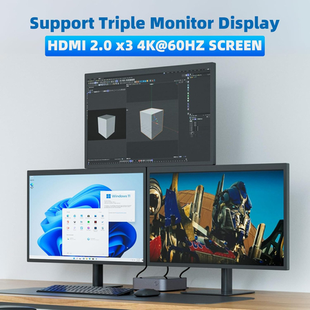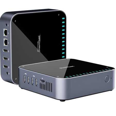 DreamQuest Mini PC оснащений трьома HDMI 2.0 портами і графікою Intel UHD 600, підтримуючи три дисплеї з роздільною здатністю 4K UHD для підвищення продуктивності. Подвійні порти LAN і WiFi (2.4G + 5G) забезпечують стабільне підключення та розширене покриття мережі.