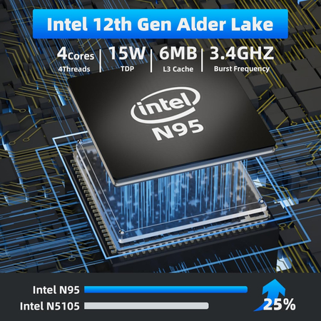 DreamQuest Mini PC оснащений процесором Intel Celeron N95 12-го покоління (4 ядра, 4 потоки, до 3,4 ГГц) і графікою Intel UHD. Продуктивність N95 на 35% вища, ніж у N5105, за меншого енергоспоживання в 15 Вт, що робить його швидким і економічним вибором для щоденних завдань.