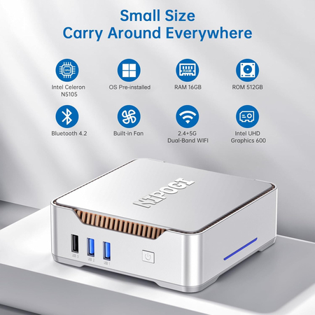 Міні-ПК NiPoGi GK3 PRO оснащений процесором Intel Celeron N5105, який має 4 ядра і 4 потоки з тактовою частотою до 2,9 ГГц. Цей процесор, порівняно з попередніми моделями Gemini Lake (J4125/N5095/N5100), забезпечує приріст продуктивності на 35%, а графічний процесор Intel UHD – на 78%. Це гарантує високу продуктивність і плавну роботу для бізнес-офісу, домашніх розваг, онлайн-навчання та зустрічей.