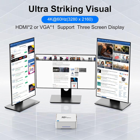 Міні настільний ПК із вбудованою відеокартою UHD 600, підтримує 4K HD на трьох екранах через 2x HDMI + 1x VGA. Через перемикач монітор/телевізор, він стає мультимедійним ПК, відкрийте для себе реалістичне зображення на відео/фото, зробіть ваш будинок справжнім кінотеатром. Насолоджуйтесь ефектом справжнього кінотеатру з сім’єю та друзями, не виходячи з дому.