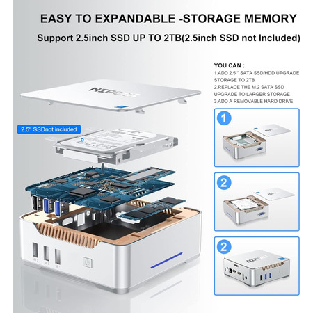 Міні ПК постачається з 12 ГБ DDR4 (вбудованої) і 128 ГБ SATA M.2 2280 SSD, також підтримує додавання 2,5-дюймового внутрішнього жорсткого диска, SSD можна оновити до 2 ТБ, і ви також можете під’єднати зовнішній жорсткий диск через 2 порти USB 3.0. Насолоджуйтесь високою швидкістю обміну файлами, онлайн-іграми та інтернет-серфінгом. Настав час звільнитися від громіздкого робочого столу!