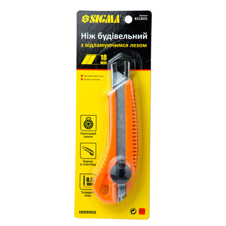 Ніж будівельний (пластиковий корпус) лезо 18мм гвинтовий замок SIGMA (8213031) призначений для розрізання із застосуванням значних зусиль різних матеріалів: килимових покриттів, картону, тканини, паперу.