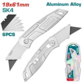 Ніж складний універсальний TOTAL THT5136236 використовується при виконанні будівельних і господарських робіт для різання нетвердих матеріалів таких як папір, картон, лінолеум, гума, шпалери. Корпус ножа із алюмінієвого сплаву. Ніж має лезо у формі трапеції 61х19 мм. У комплекті п'ять трапецієподібних лез.