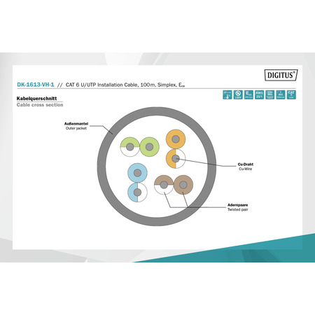 Патч-корд DIGITUS CAT 6 U-UTP довжиною 100 метрів, з провідником AWG 23/1, LSZH-1 (Low Smoke Zero Halogen), фіолетового кольору та модельний номер DK-1613-VH-1 призначений для з'єднання мережевих пристроїв, таких як комп'ютери, роутери, комутатори та інше, у структурованих кабельних системах. Категорія 6 означає, що патч-корд відповідає стандартам Category 6 і може забезпечити передачу даних на швидкостях Gigabit Ethernet і нижче. U-UTP (Unshielded, Unshielded Twisted Pair) означає, що кабелі в кабелі не екрановані, забезпечуючи простоту установки. LSZH-1 означає, що оболонка кабелю виконана з матеріалу з низьким димленням та нульовим вмістом галогенів, що робить його безпечним для використання у приміщеннях. Патч-корд фіолетового кольору може використовуватися для організації мережевих систем та забезпечення легкої ідентифікації підключень. Кабель DIGITUS CAT 6 U-UTP є надійним та високоякісним рішенням для створення мереж зв'язку з високими вимогами до швидкості передачі даних.