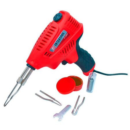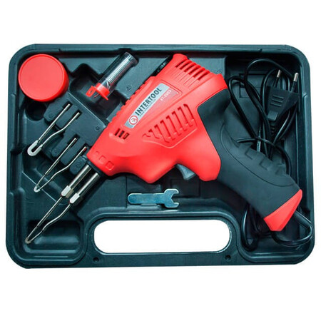 Паяльник виконаний у формі пістолета з курком, його зручно тримати в руці, повністю прогумована ручка для кращої фіксації в долоні. Жала паяльника швидко знімаються й так само швидко встановлюються за допомогою різьбових з'єднань. Міцний пластиковий корпус не деформується під впливом температур, термостійкий. Довгий мережевий дріт 1,5 метра для комфортнішої роботи. Набір інструментів компактно розміщується у зручному та міцному пластиковому кейсі для зберігання та транспортування.