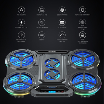 Наший продукт також оснащений LCD-дисплеєм, який відображає інформацію про температуру, щоб ви завжди мали під контролем роботу системи охолодження. Додатковим бонусом є тримач для смартфона, який робить цю підставку не тільки функціональною, але й практичною для вас.