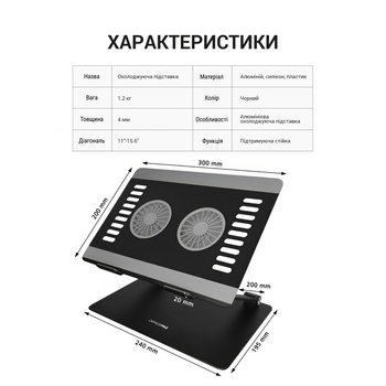 Ця охолоджуюча підставка ідеально підходить для ноутбуків розміром від 11 до 15.6 дюймів, забезпечуючи оптимальну вентиляцію та збереження продуктивності вашого пристрою.