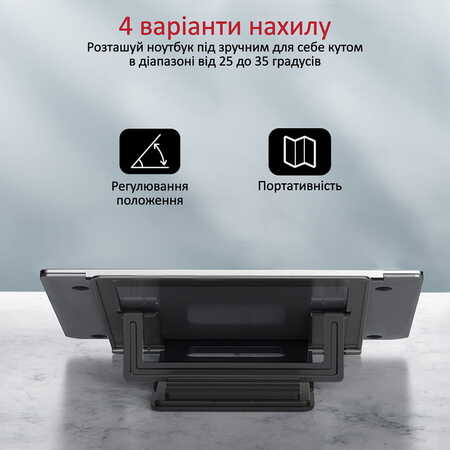 - 4 варіанти нахилу: розташуй ноутбук під зручним для себе кутом у діапазоні від 25 до 35 градусів