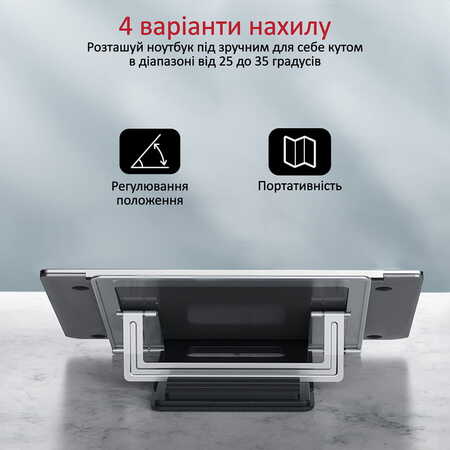 - 4 варіанти нахилу: розташуй ноутбук під зручним для себе кутом у діапазоні від 25 до 35 градусів